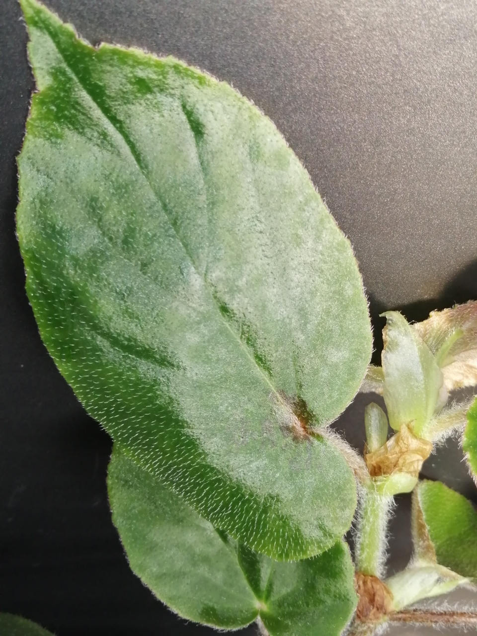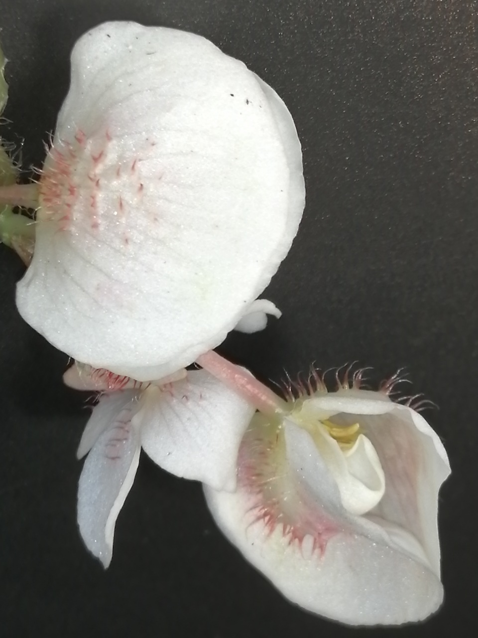 Begonia molto interessante. Il suo fogliame verde scuro con pagina inferiore rosso scuro. Il portamento รจ eretto. La dimensione piuttosto contenuta. i fiori sono grandi e coperti, da sottile peluria.