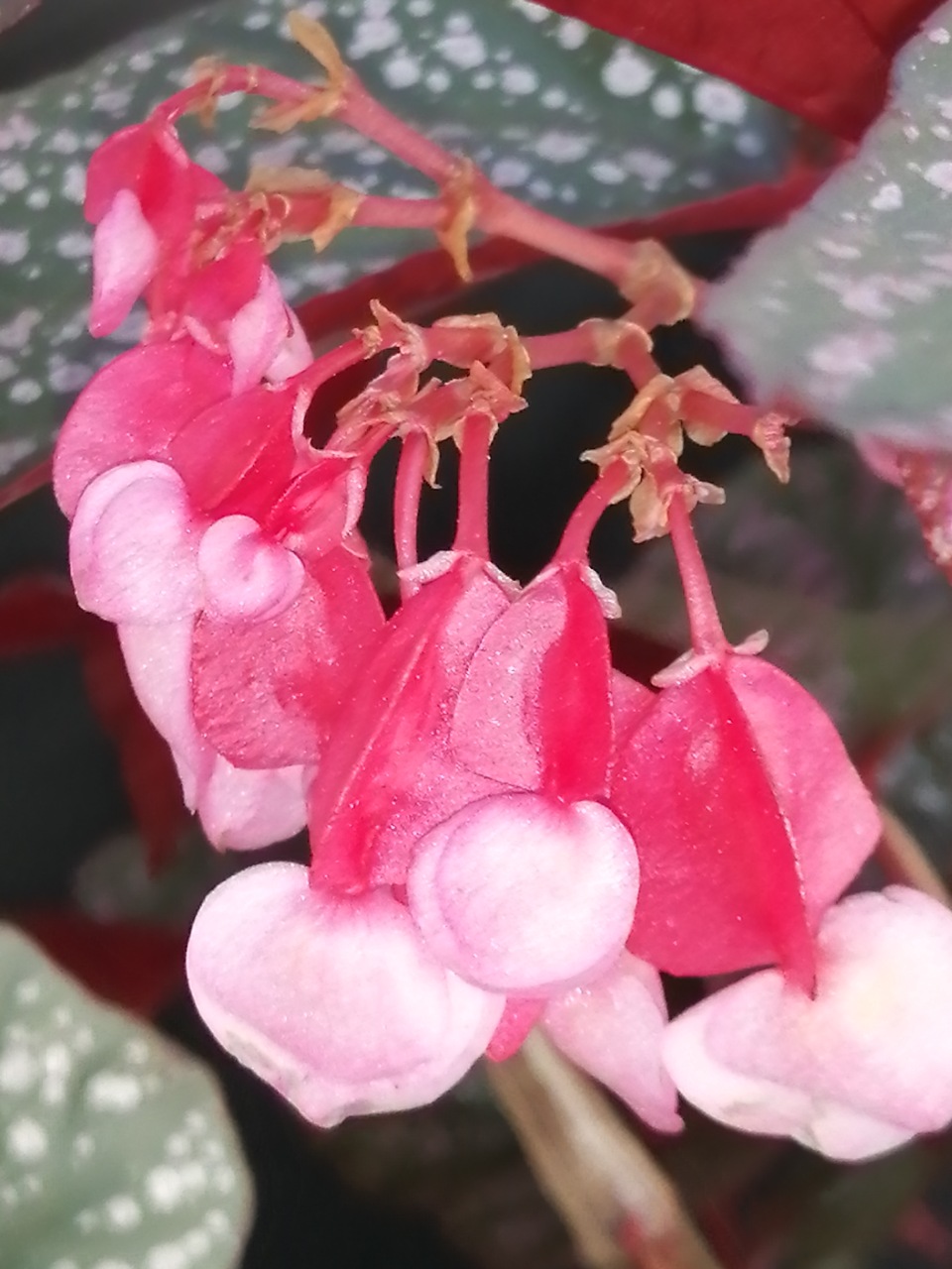 La Begonia Linda puรฒ produrre fiori rosa/rosso pallido o rosa intenso, spesso penduli o in piccoli gruppi sotto il fogliame. La produzione di fiori puรฒ essere regolare in condizioni di coltivazione favorevoli (luce indiretta luminosa e alta umiditร ).