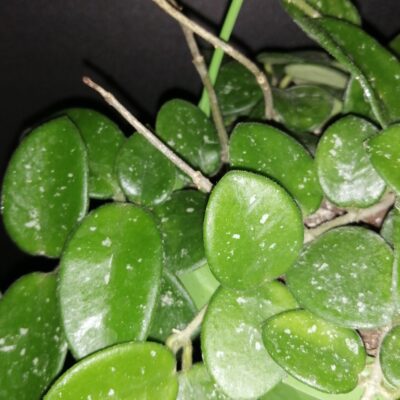 Hoya Mathilde . Deliziosa questa cultivar di Hoya carnosa var.carnosa x Hoya serpens. Ha un bel portamento ricadente e compatto, ordinato, foglie carnose verde scuro macchiettate di bianco. I fiori sono stellati rosa chiarissimo ed hanno dolce profumo.
