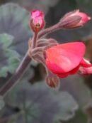 Pelargonium Wallis Friesdorf : Pelargonio miniatura zonale dal fogliame rosso bronzeo e dai fiori rosso arancio brillante. Grandissima resistenza al sole e al caldo.