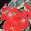 Varietà di Pelargonium zonale dai fiori rosso brillante, semplici. Spettacolari le foglie variegate e zonate di giallo crema e rosso scuro.