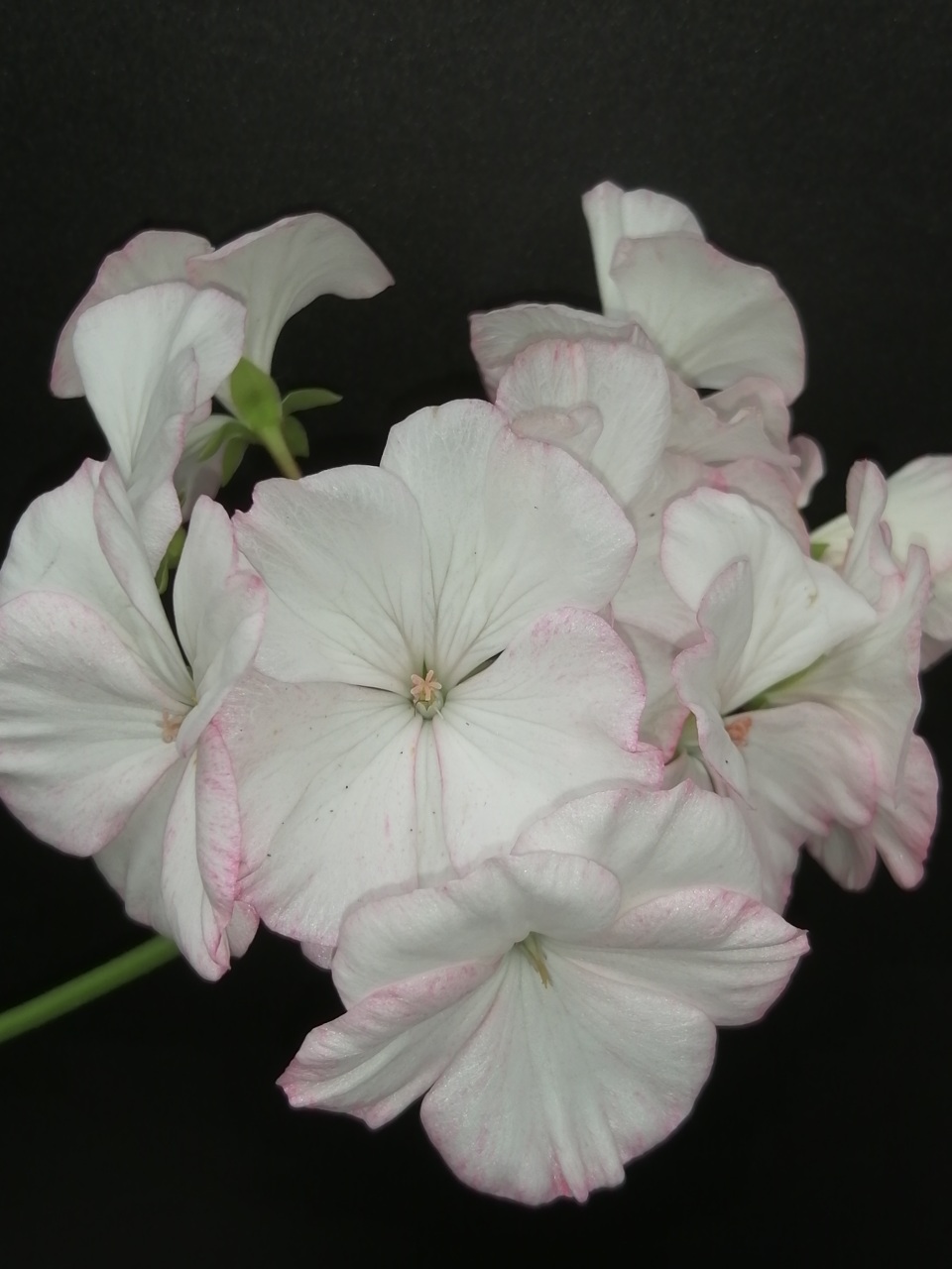 Varietà di Pelargonium zonale dai fiori sontuosi. I fiori sono semplici, bianco rosato delicatissimo. Le foglie sono grandi verdi.