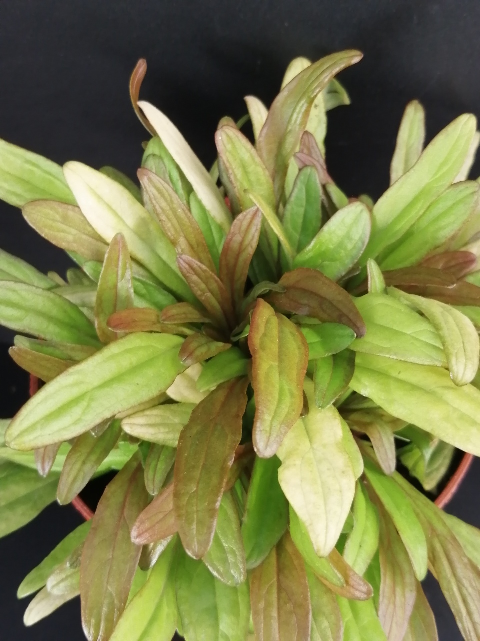 nuova selezione a foglie sfumate di verde acido e bruno strette e allungate. Fiori rosa.